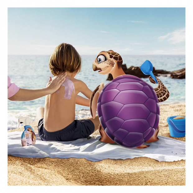 Sensilis Pediatrics Lotion Spray SPF50+ tem uma fórmula à base de água, com uma cor divertida.