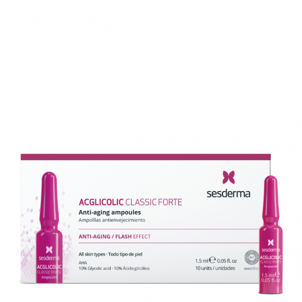 Sesderma Acglicolic Classic Forte é um concentrado intensivo em ampolas, com uma combinação de ácido glicólico (10%), bisabolol, ergotioneína, vit C+E, epilóbio, centelha asiática, ácido hialurónico, NMF e proteínas tensoras vegetais para uma ação esfoliante, regenerante, calmante, antioxidante, hidratante e reafirmante.