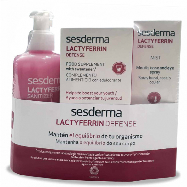 Sesderma Lactyferrin Defense Kit é um kit com 1 Gel Higienizante de Mãos (250ml), 1 Suplemento Alimentar Fortificante (250ml) e 1 Spray Protetor Bucal, Nasal e Ocular (100ml) que mantém o organismo protegido e equilibrado.