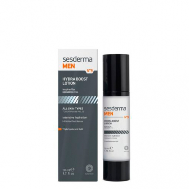 Sesderma Men Nº9 Loção Hydra Boost é um cuidado hidratante que resulta da combinação de ingredientes ativos: composto de algas e plantas marinhas (ADS 11) e ácido hialurónico para uma ação hidratante, protetora, anti-rugas e revitalizante.