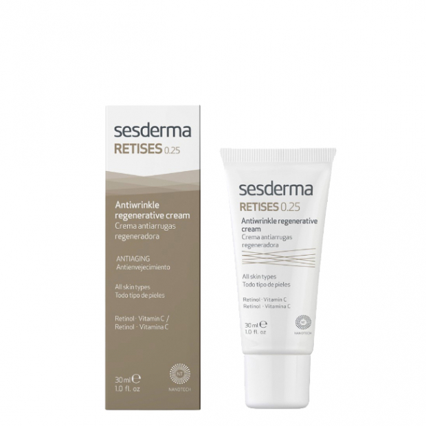 Sesderma Retises 0.25% Creme é um cuidado hidratante anti-rugas que resulta da combinação de ingredientes ativos: concentração de retinol puro (0.25%) e vitamina C (1%) para uma ação anti-rugas, regeneradora, despigmentante, esfoliante, hidratante e protetora.