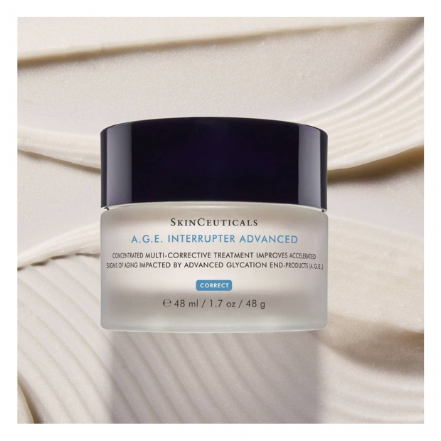 SkinCeuticals A.G.E. Interrupter Advanced é um creme antienvelhecimento indicado para pele madura com sinais de idade visivelmente marcados, que atua ao nível da glicação (um dos processos responsável pela formação das rugas) para ajudar a aumentar a elasticidade e espessura da pele.