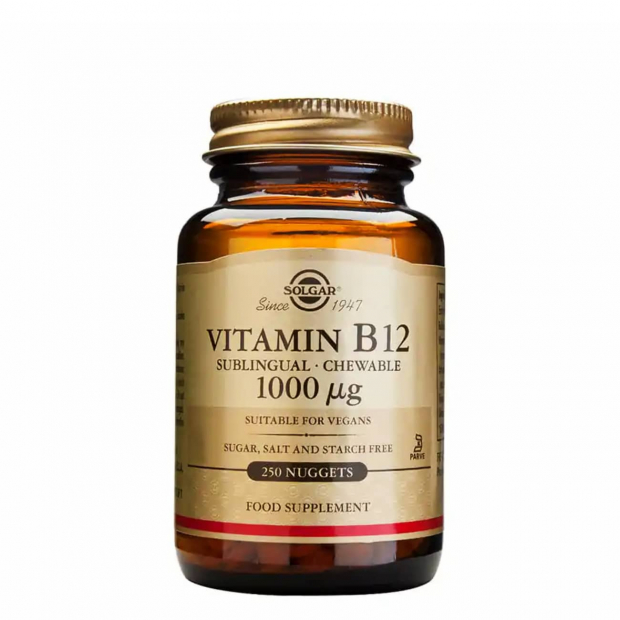 Solgar Vitamina B12 Suplemento contém 1000 µg de vitamina B12 (cianocobalamina), uma elevada concentração para aumentar a produção de energia em situações que requeiram doses reforçadas de vitamina B12.
