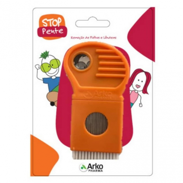 Stop Pente é um pente mais específico para a remocão de piolhos e lêndeas. Com uma lupa que permite um aumento até 200x e cerdas metálicas.