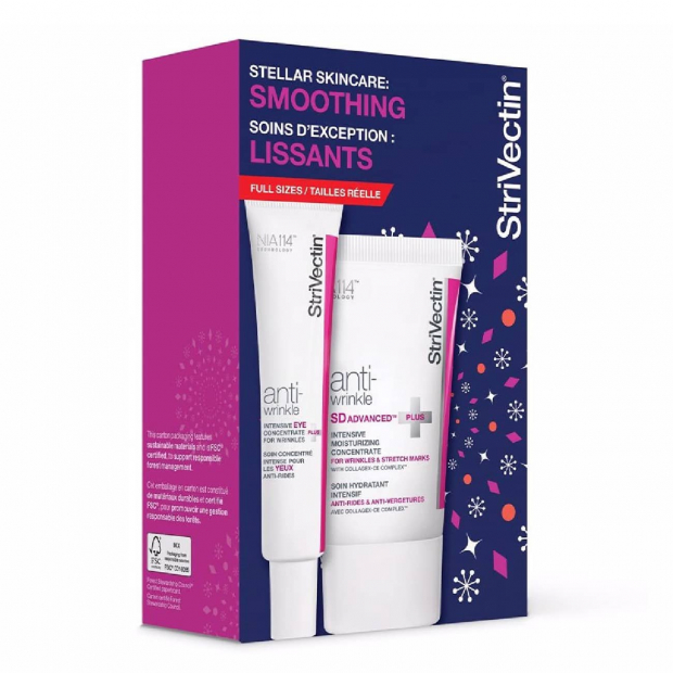 - Strivectin Anti-Wrinkle SD Advanced Plus Creme, que combina NIA-114 (niacina), complexo Collagex-CE com tripeptídeos de cobre, fermento marinho e extrato de lírio branco, para uma ação antirrugas, hidratante, suavizante e refirmante