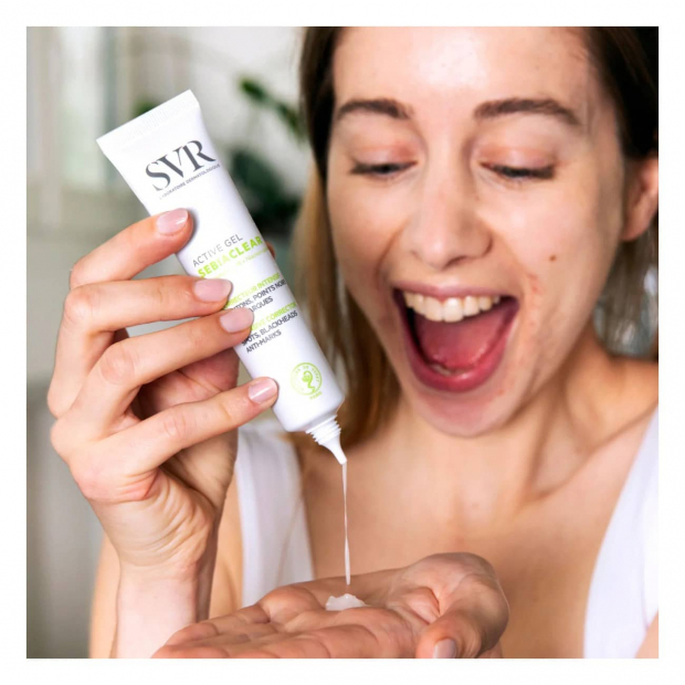 Aplica SVR Sebiaclear Active Gel em todo o rosto, após a limpeza, de manhã e à noite.