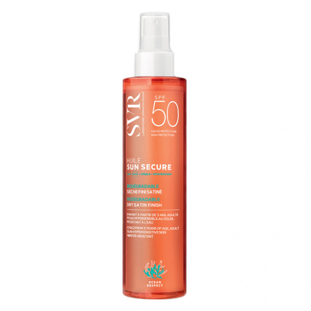 SVR Sun Secure SPF50+ Óleo Solar tem uma textura em óleo seco, sedoso e uma fórmula de elevada tolerância.