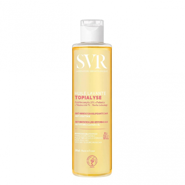 O SVR Topialyse Óleo Micelar Relipidante pode substituir o gel de banho, o shampoo, gel de higiene íntima, gel de limpeza de rosto e corpo e desmaquilhante.