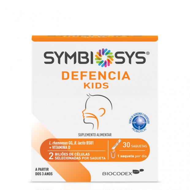 Symbiosys Defencia Kids contém estirpes únicas: Bifidobacterium lactis BS01 e Lactobacillus rhamnosus GG. Cada saqueta contém 2 biliões de bactérias e também 0,75 µg de vitamina D3 (15% da dose de referência). Desenvolvido para complementar uma dieta variada e equilibrada e para reforçar o sistema imunitário.