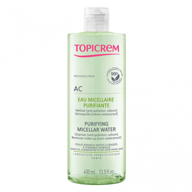 Topicrem AC Control Água Micelar tem uma fórmula de elevada tolerância, com 99% de ingredientes de origem natural.