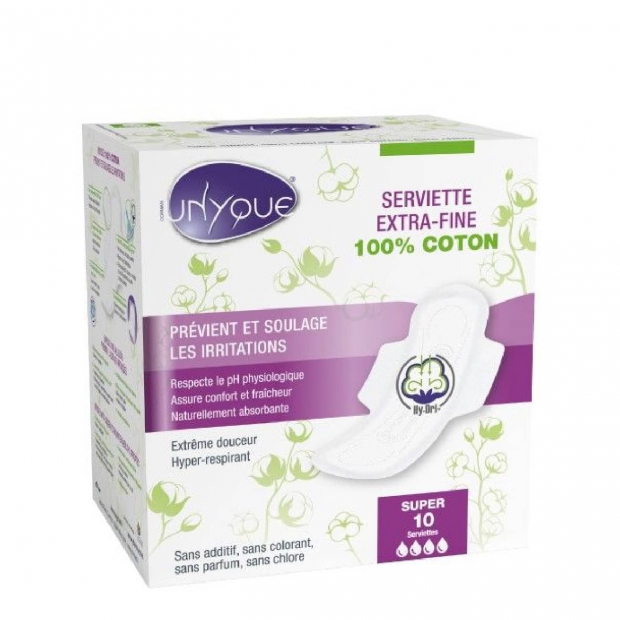 Unyque Pensos Higiénicos são pensos em algodão puro (100%), macio e respirável, com absorção excepcional, de formato anatómico e com abas laterais, com tiras adesivas para manter o penso seguro.