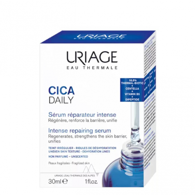 Uriage Bariéderm-Cica Daily Sérum tem um complexo térmico-biótrico (10.5%) combinado com prebiótico, centelha asiática, ácido hialurónico de alto e baixo peso molecular e vitamina B5 para reequilibrar a barreira cutânea, acalmar, hidratar e promover a reparação epidérmica.
