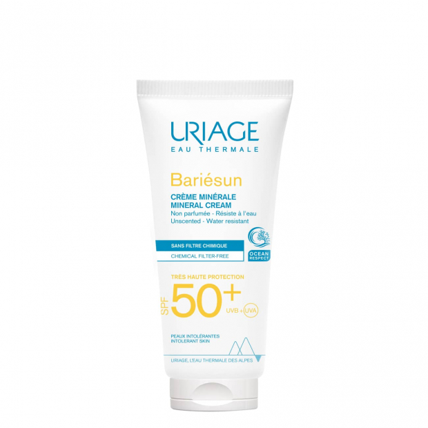 Uriage Bariésun Creme Mineral FPS50+ tem uma fórmula enriquecida com água termal Uriage, dióxido de titânio e óxido de zinco (fotoprotecção UVA-UVB) que protege a pele dos efeitos nocivos da exposição solar. Contém Aquaspongines®, complexo hidratante Uriage, e as vitaminas C e E que neutralizam a ação de radicais livres, prevenindo o envelhecimento precoce da pele.