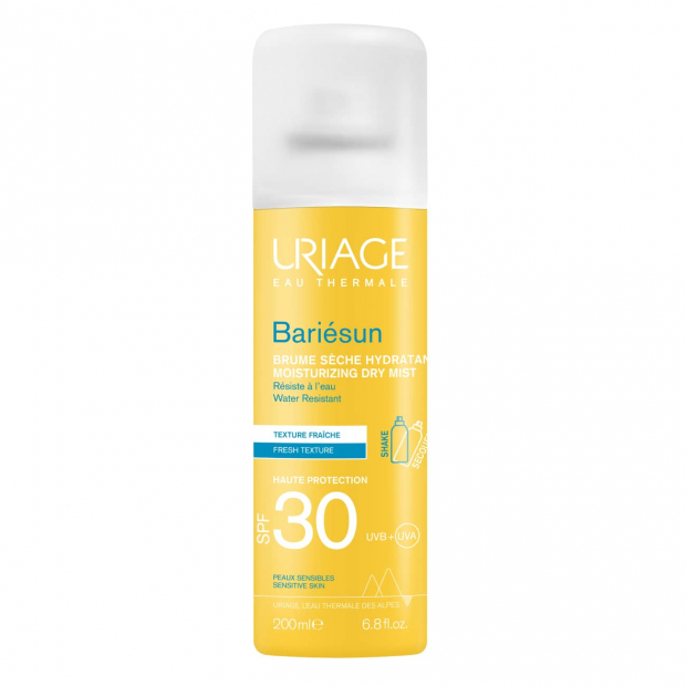 Vaporiza Uriage Bariésun Bruma Solar Toque Seco SPF30 na pele do rosto e corpo, 30 minutos antes da exposição solar. Reaplica a cada duas horas ou após o banho. Não vaporizes diretamente no rosto.