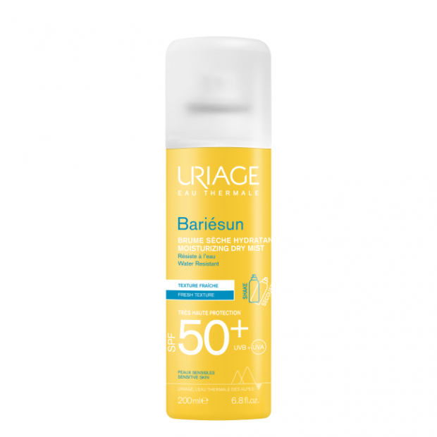 Uriage Bariésun SPF50+ Bruma tem uma textura em bruma leve, com complexo filtrante inovador fotoestável e largo espectro, vitamina C e E, aquaspongines e água termal para uma ação protetora, refrescante, antioxidante, fortificante, corretora, hidratante e calmante.