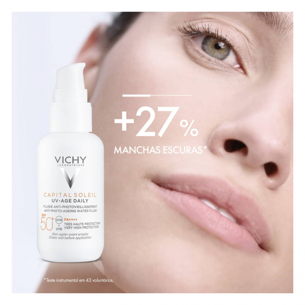 Vichy Capital Soleil UV-Age Daily Fluido tem uma textura ultraleve, invisível e não oleosa, perfeita para utilizar todos os dias, mesmo durante o inverno.