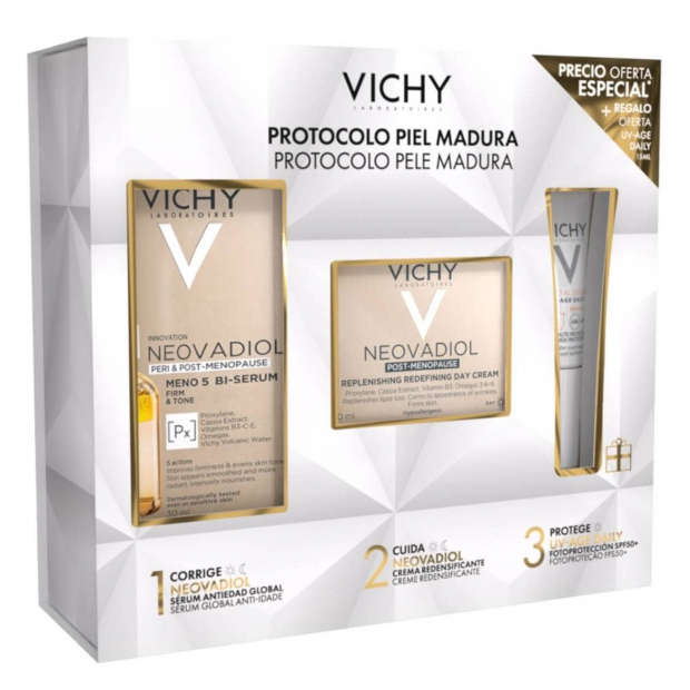 Combate os principais sinais de envelhecimento associados à menopausa com o Vichy Neovadiol Coffret Protocolo Pele Madura.