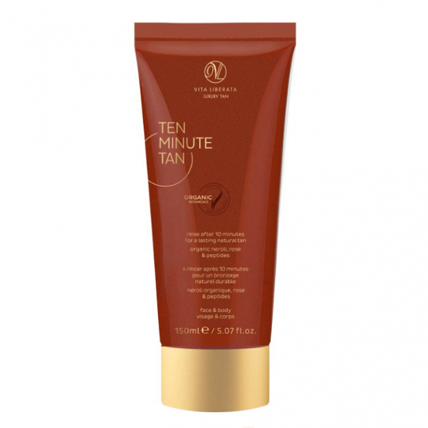 Vita Liberata Ten Minute Tan Loção tem uma textura em loção fundente de cor, com uma combinação de complexo Matrixyl 3000 Peptide, extrato de rosa mosqueta, óleos de neroli (vitamina C) e omega, Tecnologia Odor Remove e DHA, para uma ação bronzeadora, anti-idade, estimulante, hidratante e iluminadora.