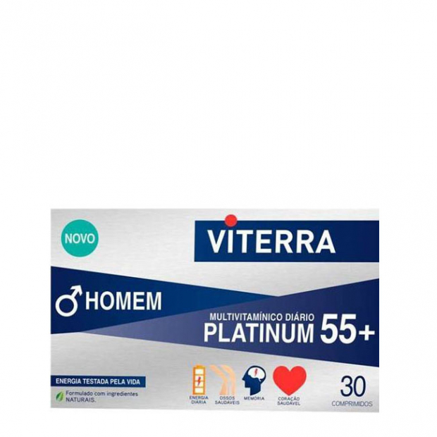 Viterra Platinum 55+ Homem Comprimidos é um suplemento alimentar, que ajuda a proporcionar vitaminas e minerais adequados aos homens a partir dos 50 anos. Satisfaz as necessidades nutricionais específicas. Equilibra o metabolismo produtor de energia e atenua o cansaço e a fadiga. Contribui para uma normal função psicológica e manutenção de ossos normais. Contribui para o bom funcionamento do sistema imunitário e sistema nervoso. Ideal para homens a partir dos 50.