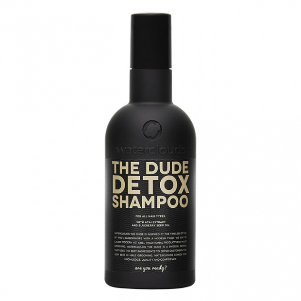 Waterclouds The Dude Shampoo Detox tem uma fórmula vegan, que combina uma base de limpeza suave, óleo de semente de mirtilo e extrato de açaí, ricos em antioxidantes e minerais, para uma ação de limpeza desintoxicante, protetora e suavizante.