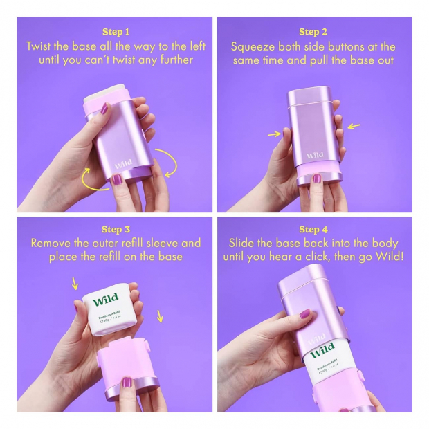 Utiliza Wild Desodorizante Natural diariamente. Cada recarga pesa 40g e durará cerca de 4-6 semanas com uso diário. Só precisas de aplicar 2 passagens suaves - muito menos do que um roll-on!